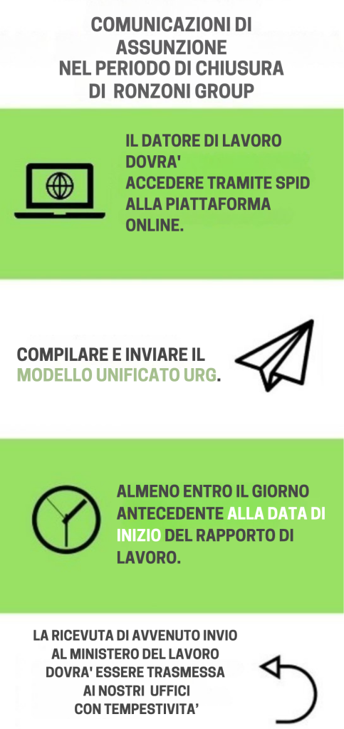 Desideriamo comunicare che nel mese di agosto, Ronzoni Group accoglierà i Clienti in sede solo su appuntamento da lunedì a giovedì, nei seguenti orari: 9:00 – 13:30 e 14:30 – 18:00. Nei venerdì di agosto 2025, l’ufficio sarà chiuso e opereremo in modalità smart working. È possibile prenotare un appuntamento telefonando o inviando una preferenza via email. 🏖️ La chiusura per le vacanze estive è dal 11 al 23 agosto inclusi, e torneremo al normale orario di apertura da lunedì a venerdì a partire dalla prima settimana di settembre. 🙏 Vi invitiamo a registrare i dati di presenza nel sistema gestionale Zucchetti, necessari per le elaborazioni, entro l’11 agosto. Per le assunzioni urgenti o le comunicazioni di infortunio durante la chiusura estiva, è possibile gestire autonomamente le comunicazioni obbligatorie per evitare sanzioni, seguendo le istruzioni fornite nel link. BUONE VACANZE! |